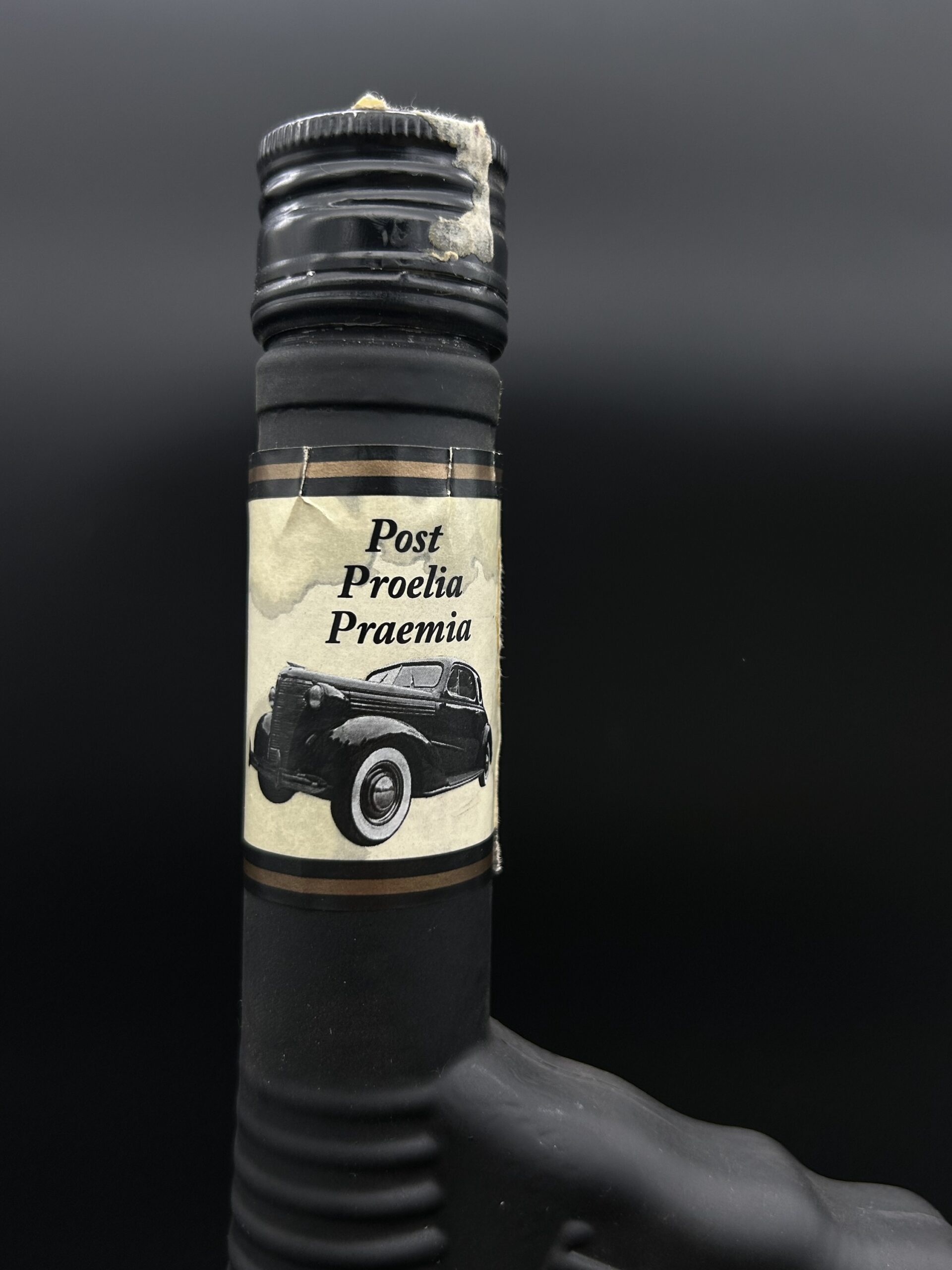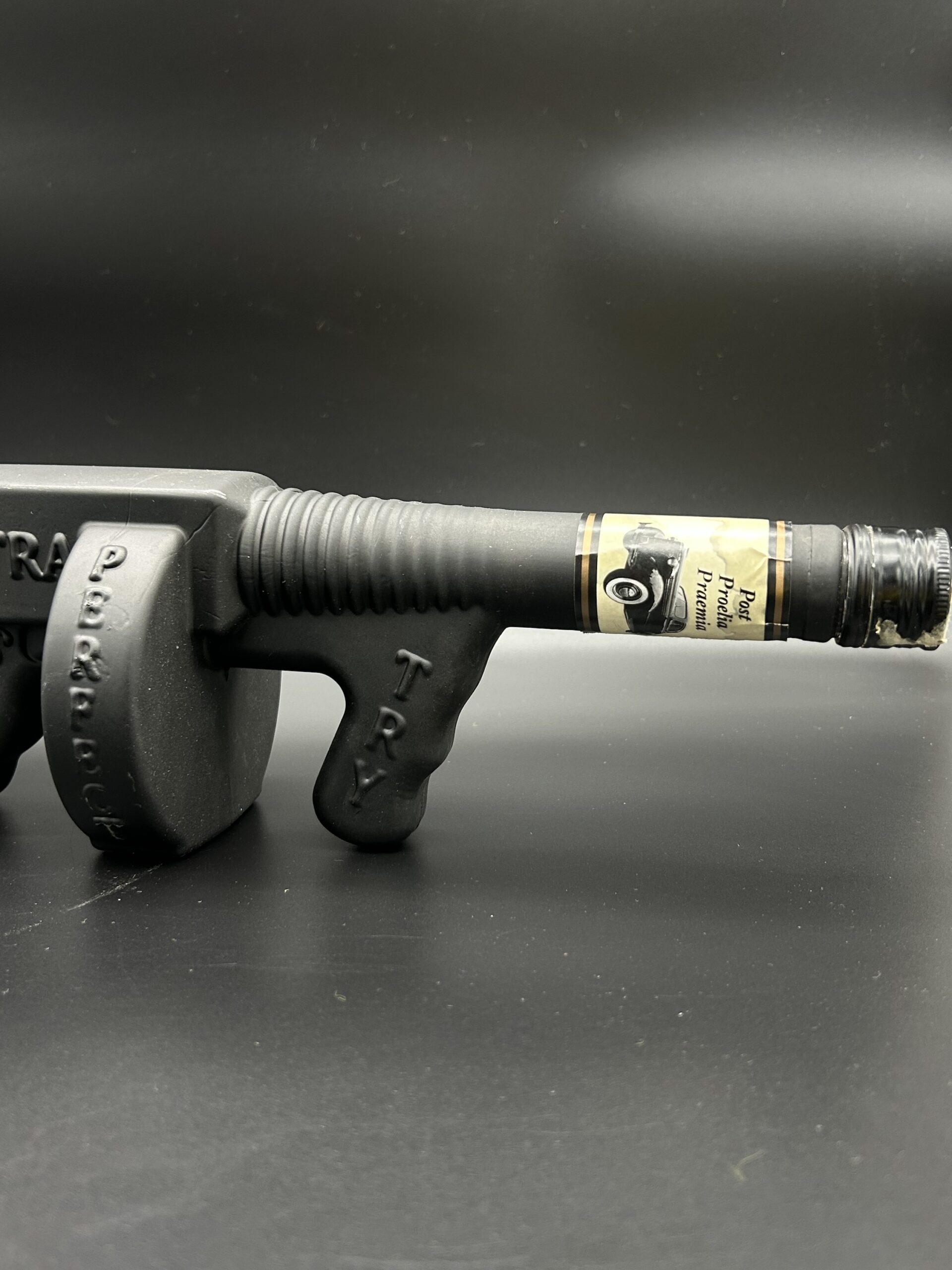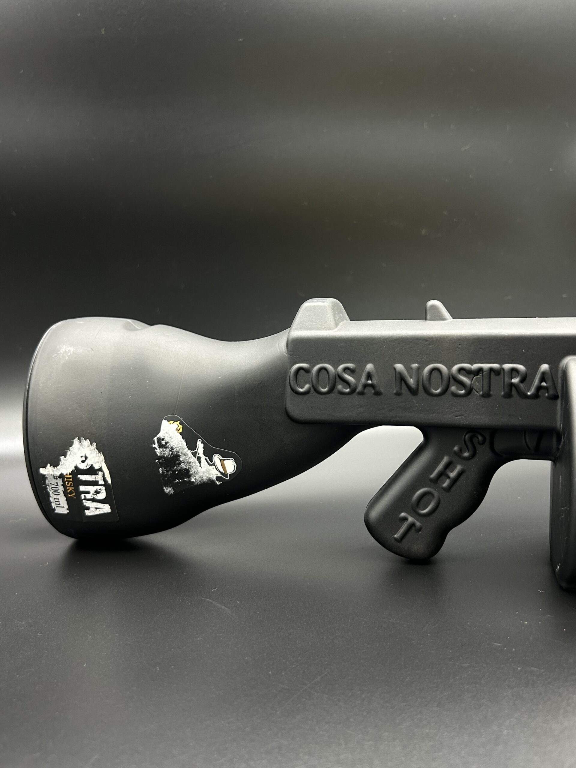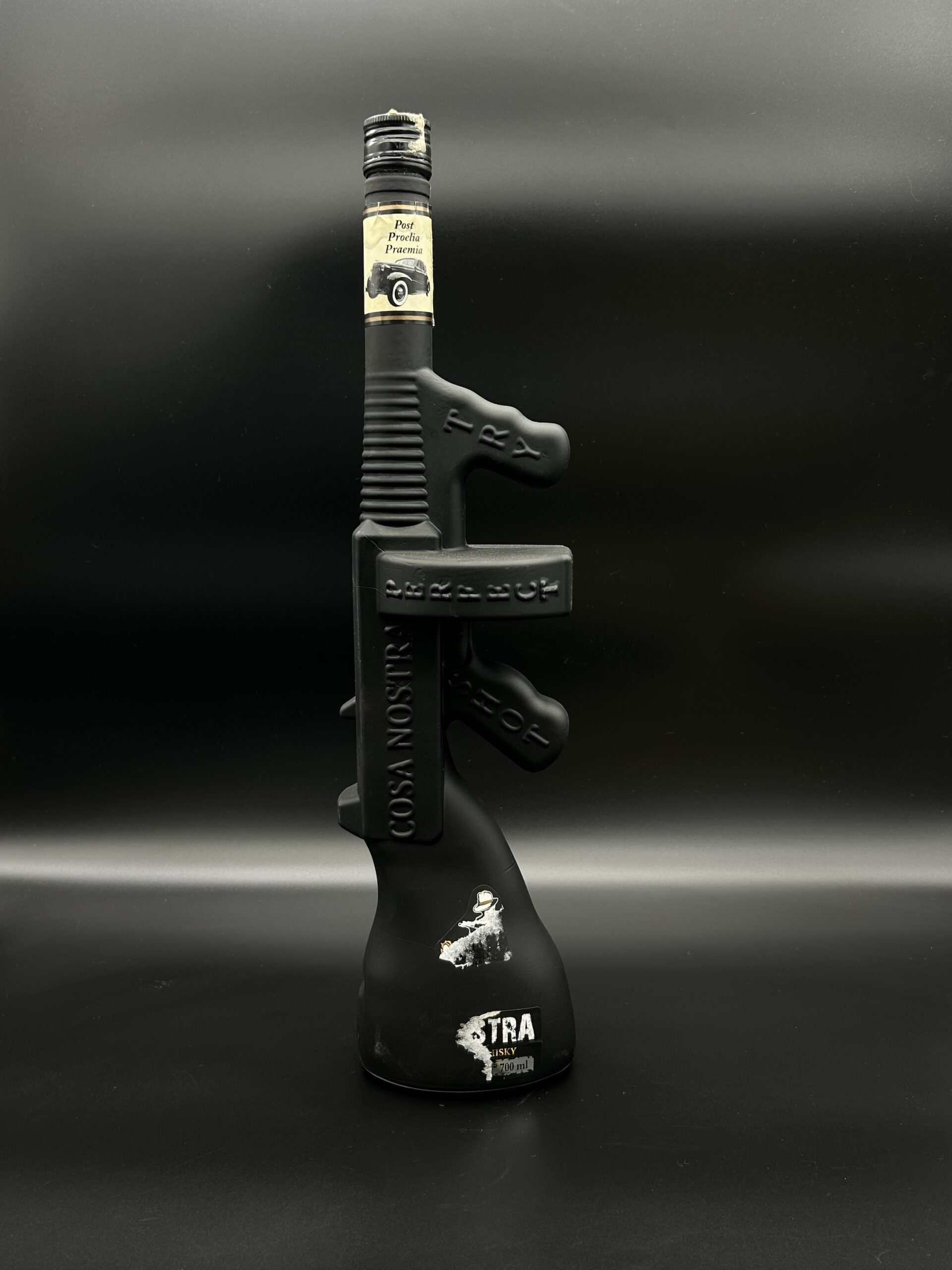 Nietypowa, czarna butelka w formie karabinu z tłoczeniami i napisem Cosa Nostra. To wyjątkowy gadżet kolekcjonerski inspirowany włoską mafią i kulturą lat 30. XX wieku. Idealna jako karafka na alkohol lub element dekoracyjny w stylu retro. Egzemplarz ozdobiony etykietą „Post Prochla Pracownia” oraz grafiką gangstera.