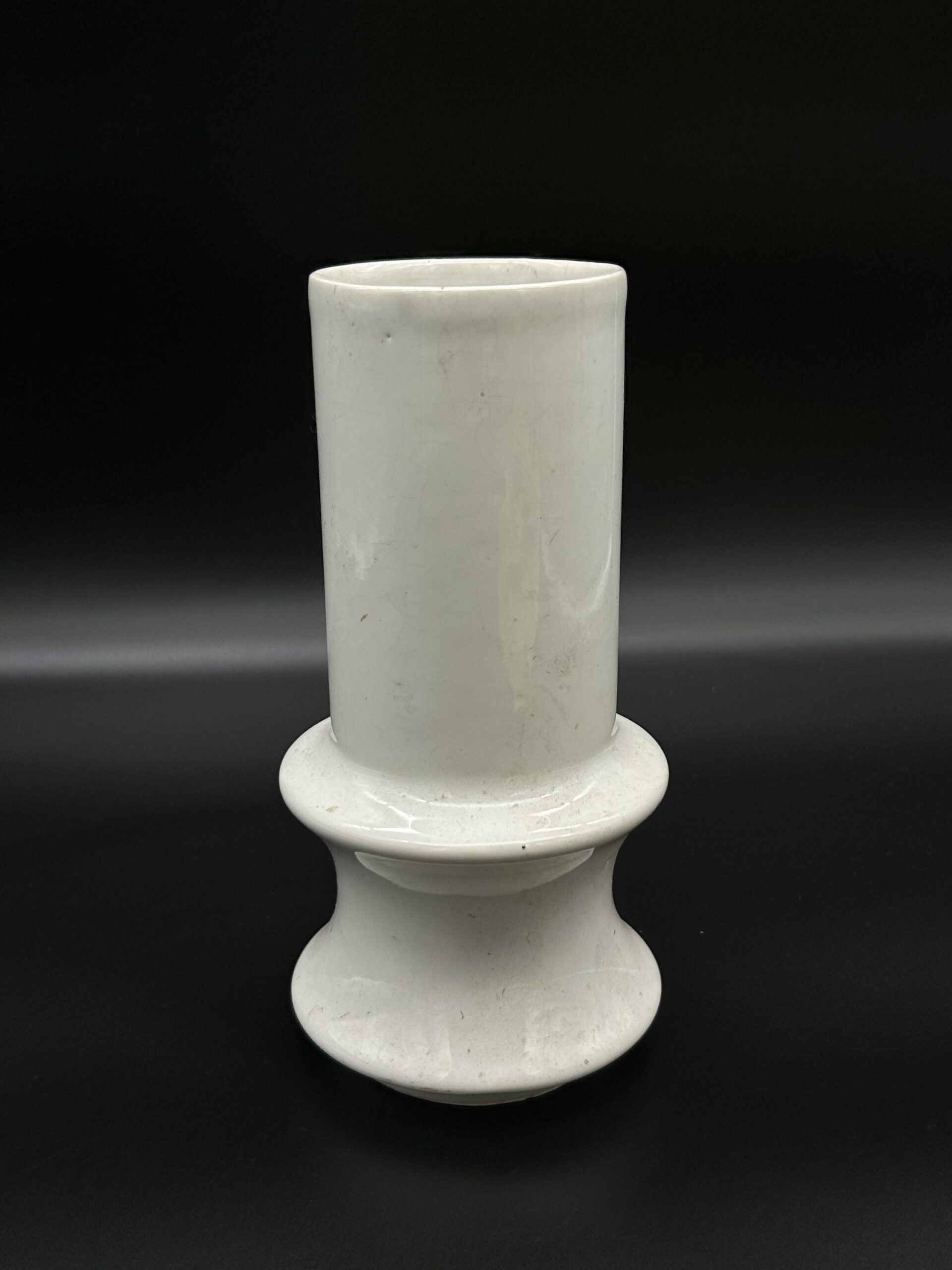 Wysoki biały wazon o cylindrycznym kształcie i prostym designie.