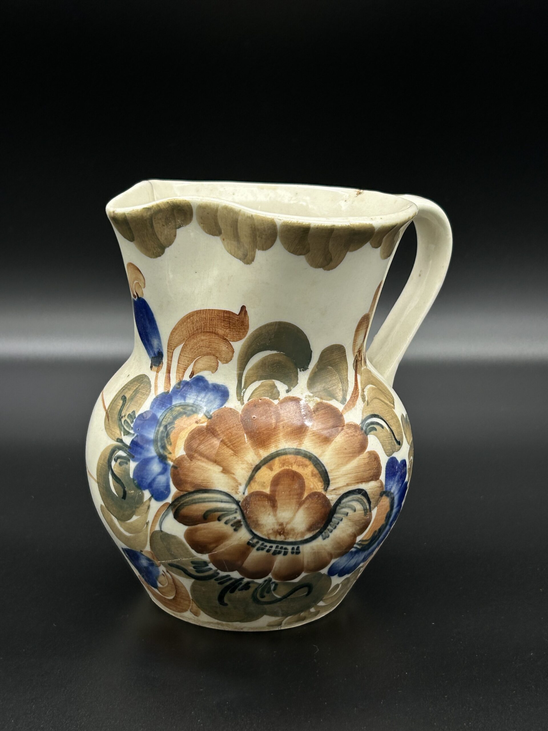 Urokliwy dzban ceramiczny zdobiony kolorowymi, ręcznie malowanymi kwiatami w odcieniach brązu, zieleni i niebieskiego. Jego klasyczna forma oraz bogate zdobienia czynią go wyjątkowym elementem dekoracyjnym. Idealny do wnętrz w stylu rustykalnym, folkowym czy vintage. Może pełnić funkcję użytkową lub kolekcjonerską.