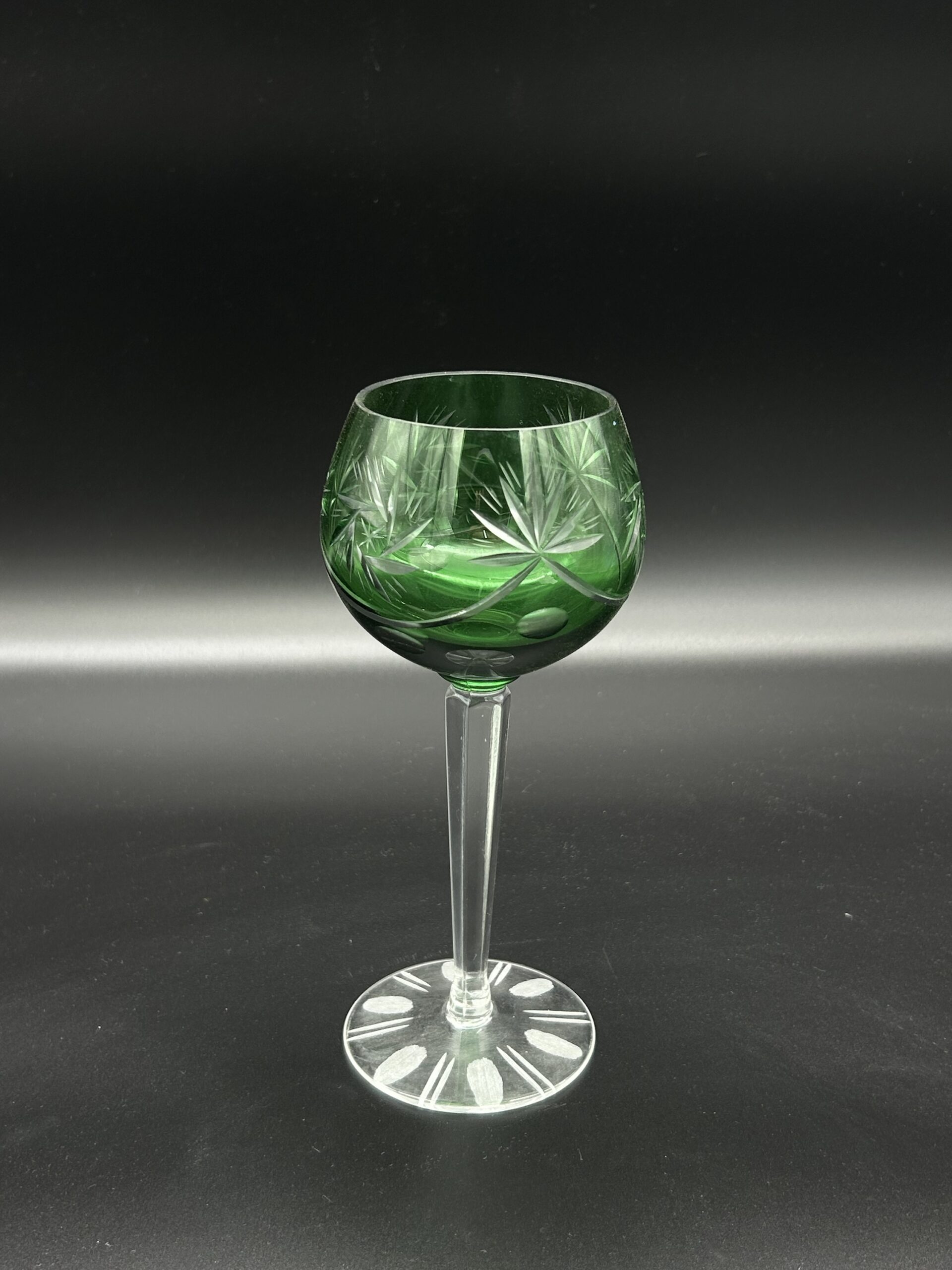 Stylowy kieliszek z kryształu o zielonej czarze zdobionej grawerowanym wzorem roślinnym. Smukła, przezroczysta nóżka nadaje mu lekkości i klasy. Idealny do serwowania wina, nalewek lub jako dekoracyjny element zastawy stołowej.