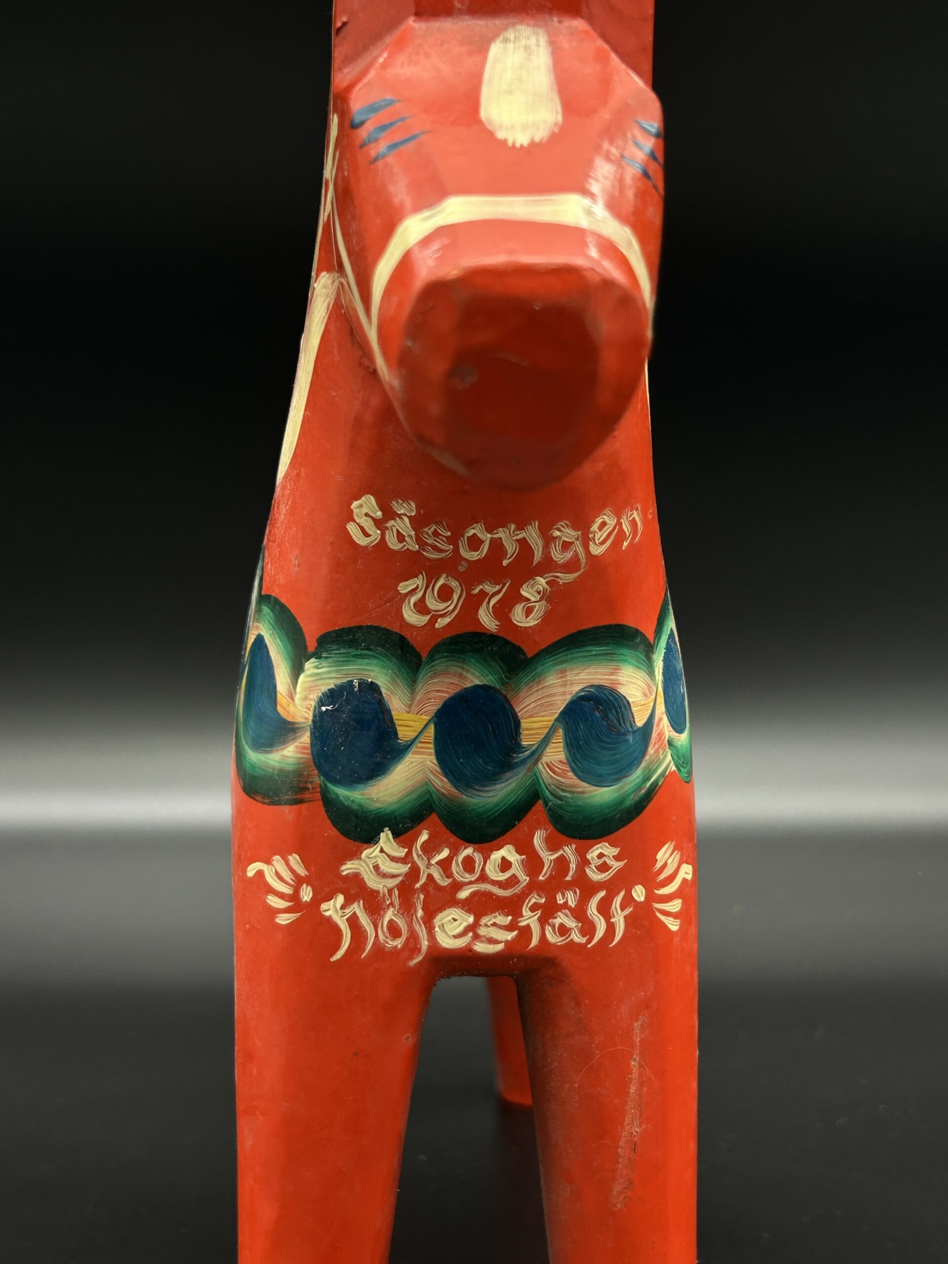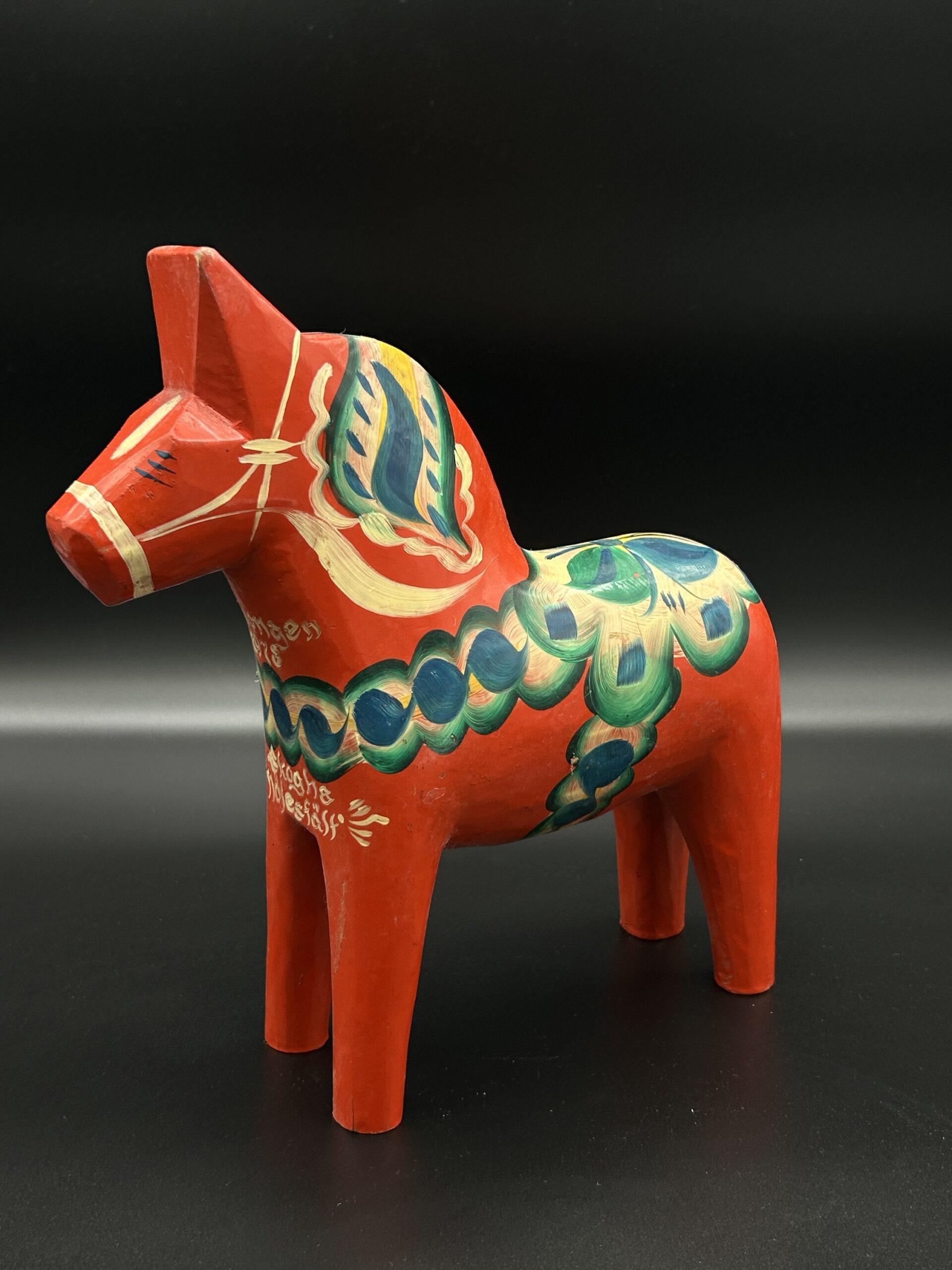 Ręcznie malowana figurka konia w intensywnej czerwieni, zdobiona tradycyjnymi wzorami w odcieniach zieleni, błękitu i złota. Symboliczny element folkloru, doskonały jako dekoracja i unikatowy prezent kolekcjonerski.