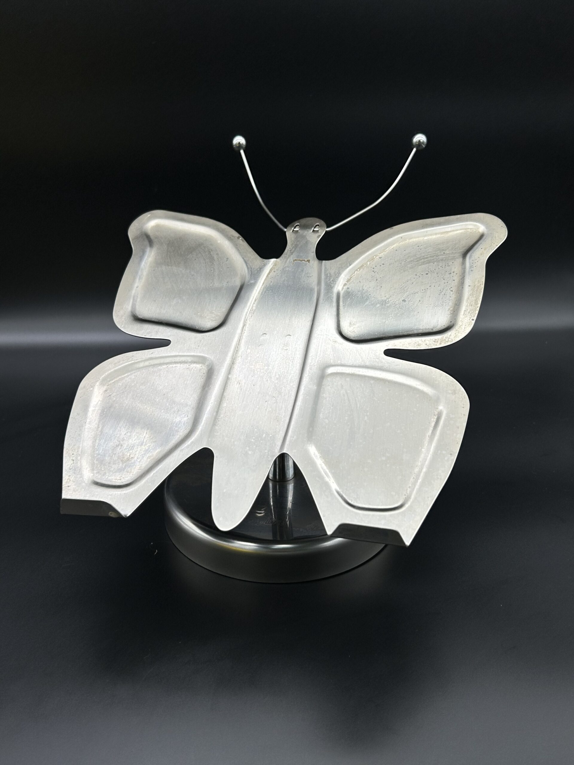 Nowoczesna dekoracja w formie metalowego motyla na podstawie.