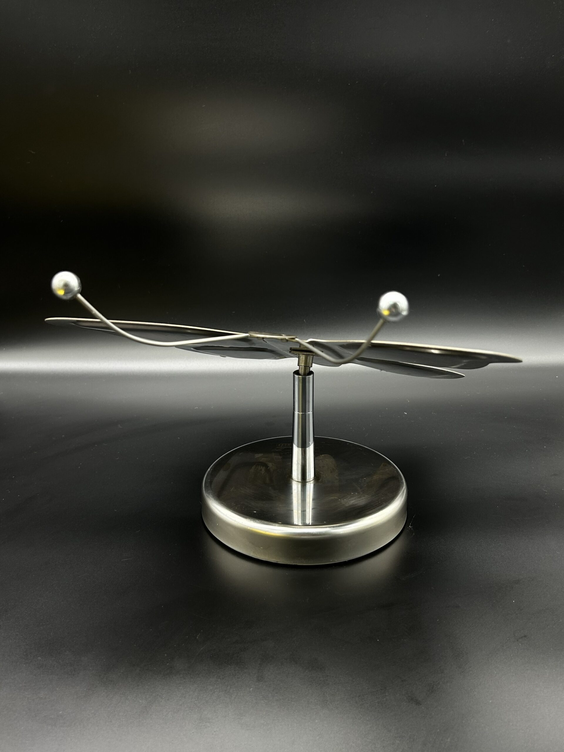 Artystyczna rzeźba przedstawiająca motyla wykonana z metalu o satynowym połysku. Ustawiona na stabilnej podstawie, idealna jako ozdoba biura, salonu lub witryny. Symbol lekkości i przemiany w eleganckim wydaniu.