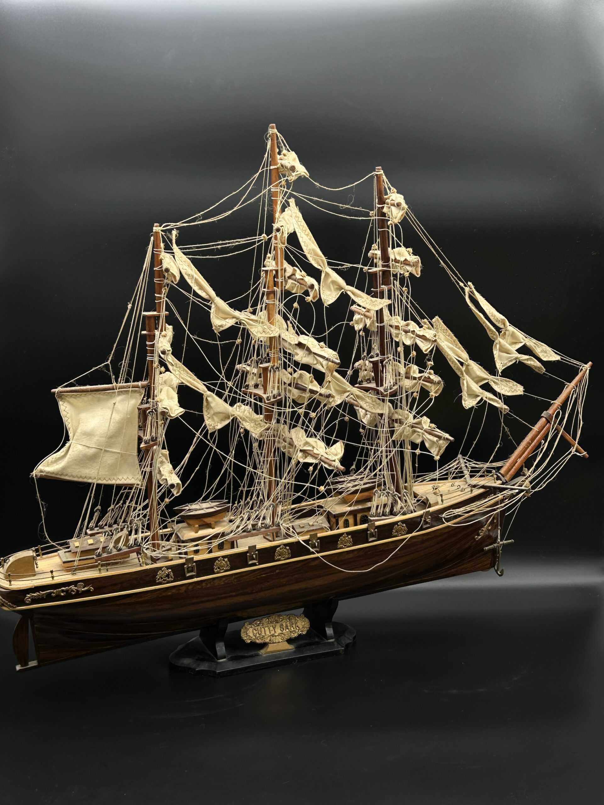 Wysokiej klasy model żaglowca Cutty Sark, wykonanego z drewna, sznurka i tkaniny. Żagle z naturalnego płótna, liczne liny i detale pokładu wiernie odtwarzają historyczny brytyjski kliper herbaciany z XIX wieku. Model umieszczony na eleganckiej drewnianej podstawie z mosiężną tabliczką. Idealny dla kolekcjonerów i miłośników marynistyki.