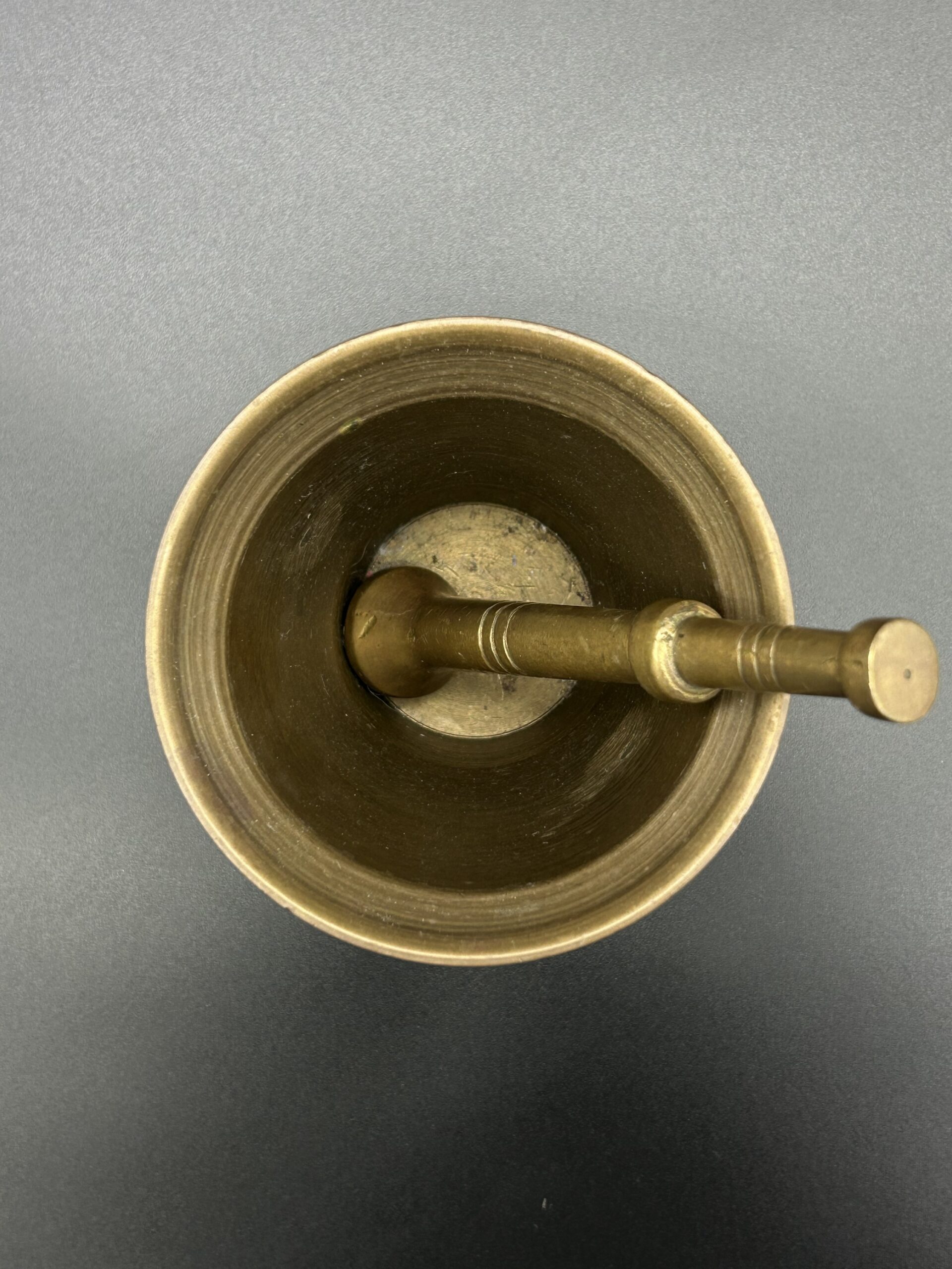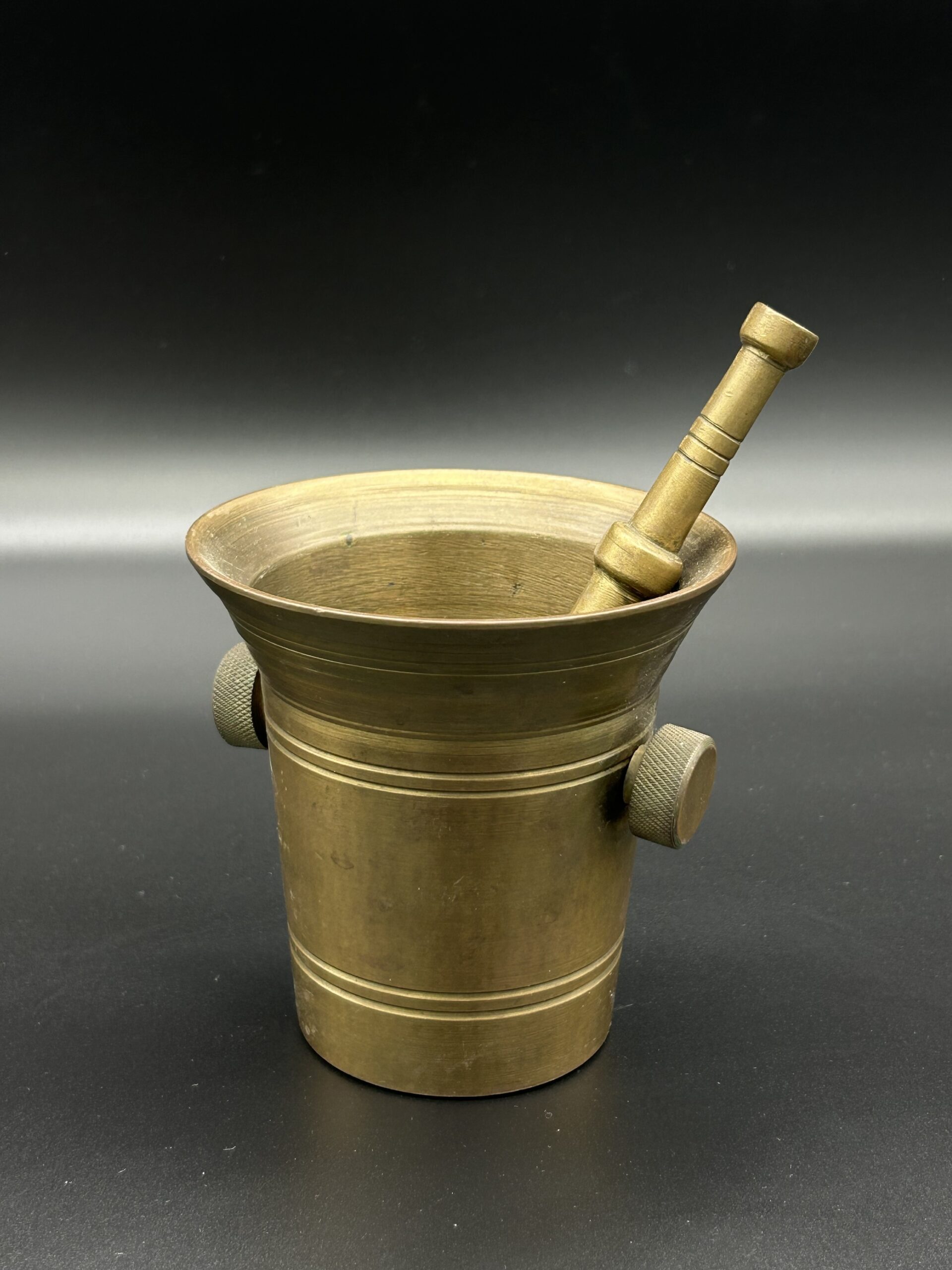 Tradycyjny moździerz z mosiądzu z oryginalnym tłuczkiem.
