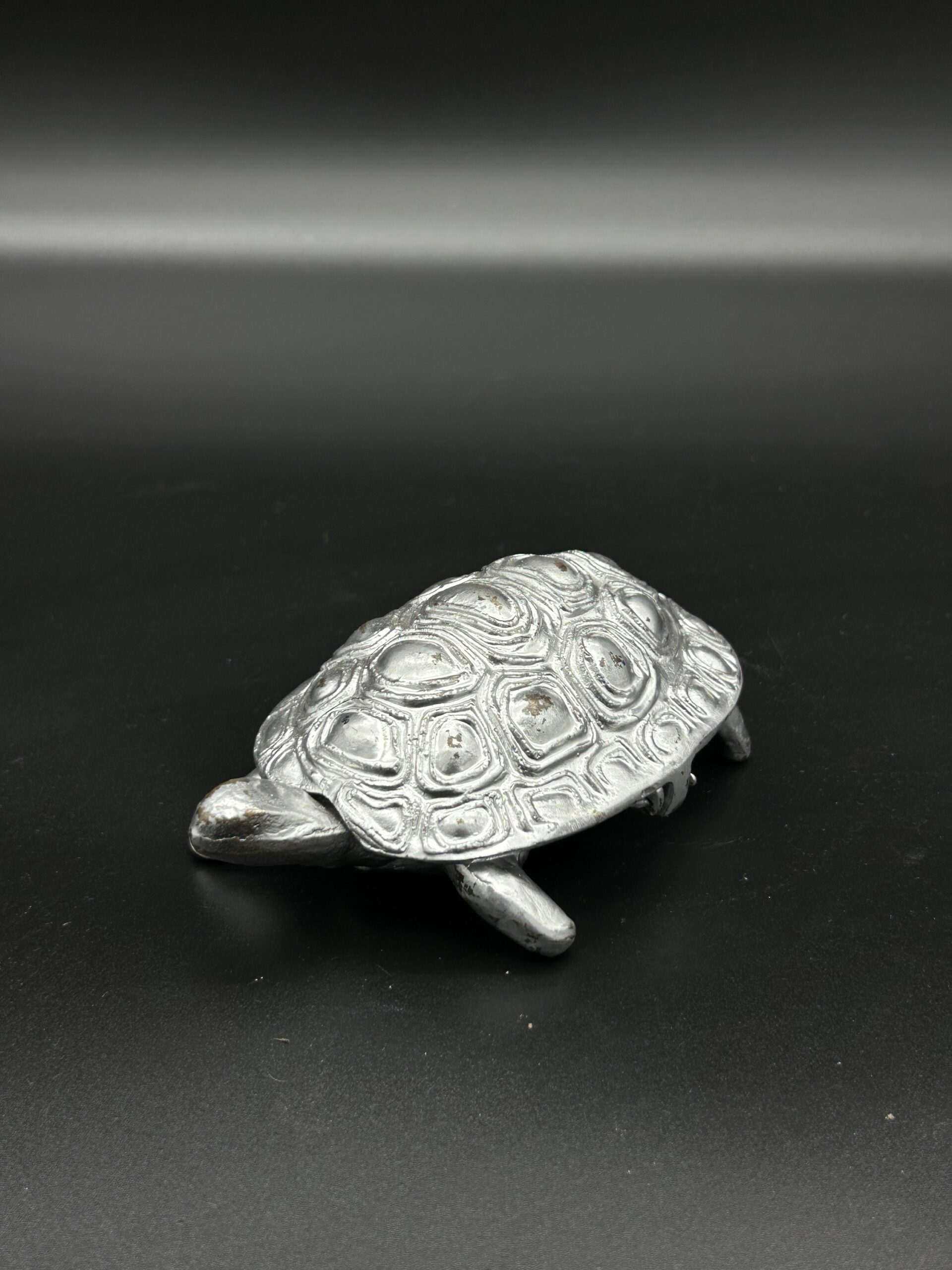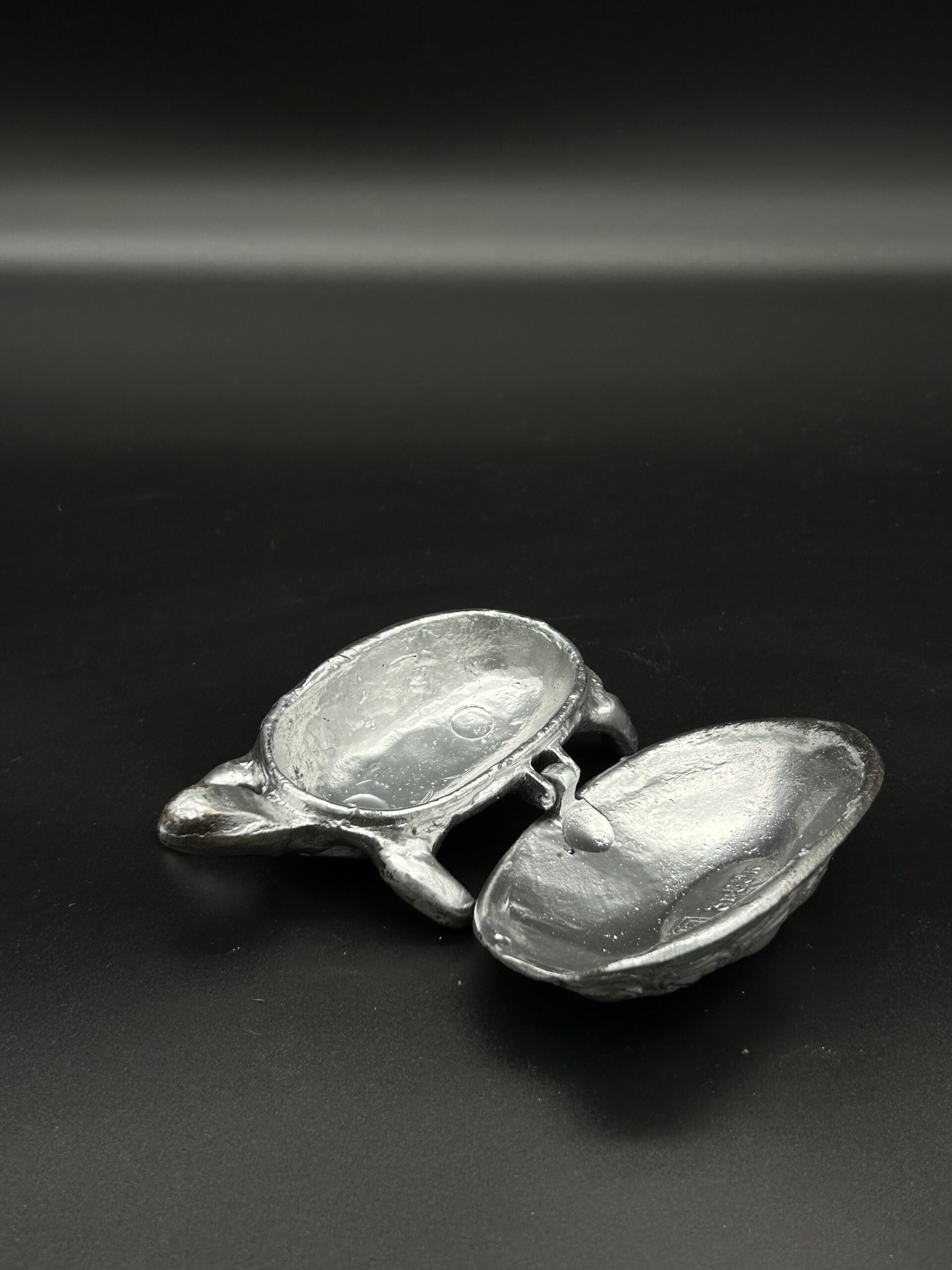 Metalowy pojemnik w formie żółwia z otwieraną skorupą. Praktyczny i ozdobny jednocześnie – doskonały do przechowywania drobiazgów lub jako nietypowa dekoracja.