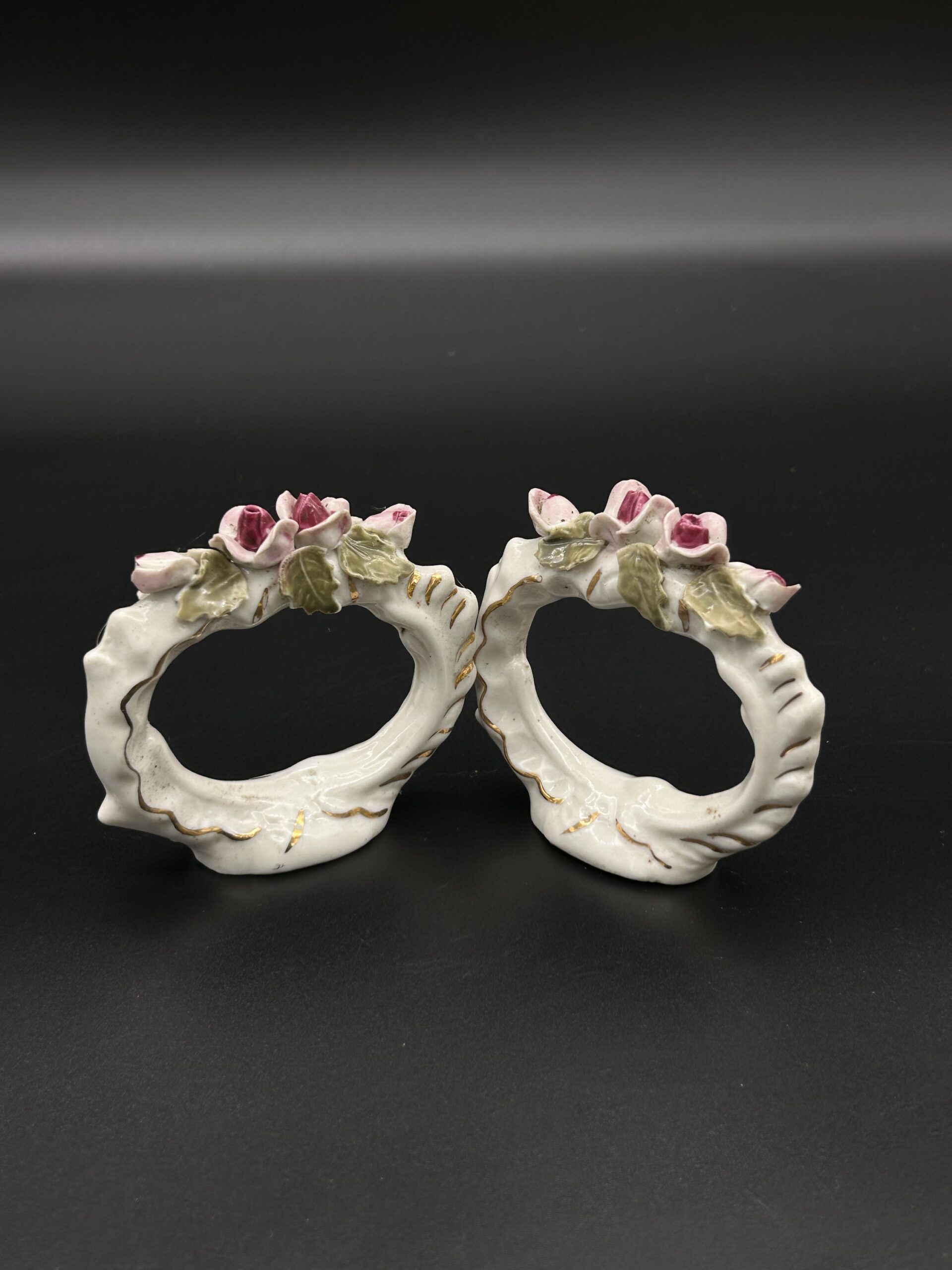 Komplet dwóch pierścieni na serwetki zdobionych kwiatami z porcelany.