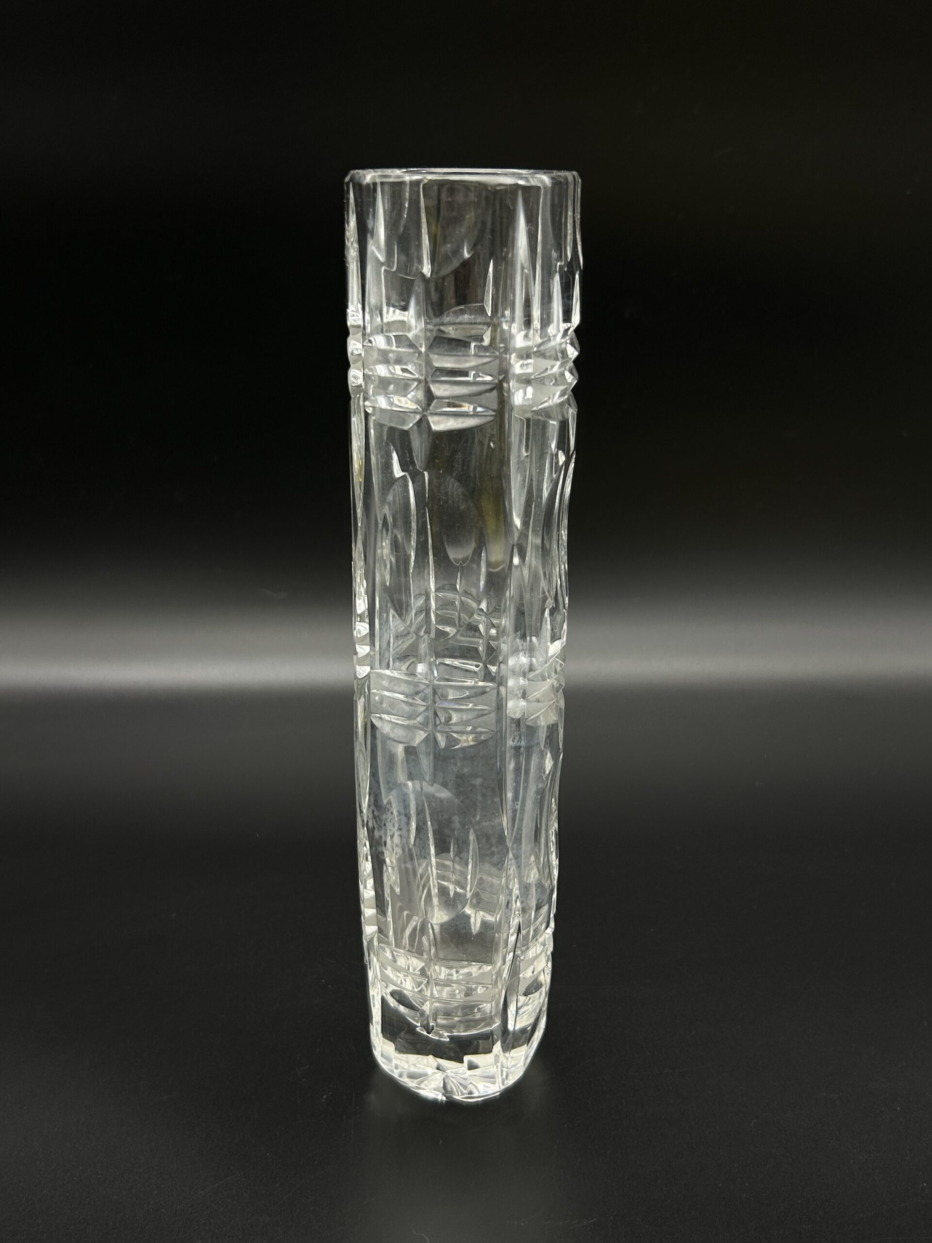 Wysoki, wąski wazon z grubego szkła kryształowego o eleganckiej formie. Geometryczny wzór nadaje mu nowoczesny, a zarazem ponadczasowy charakter. Idealny na pojedyncze kwiaty lub jako ozdoba półki.