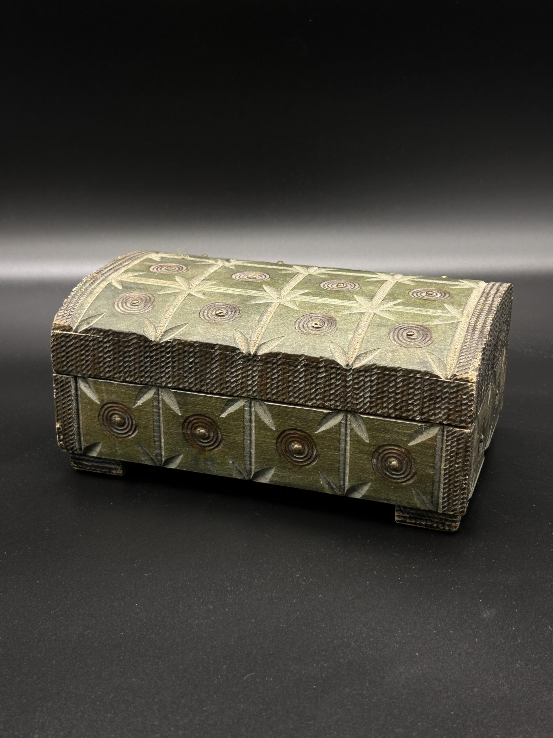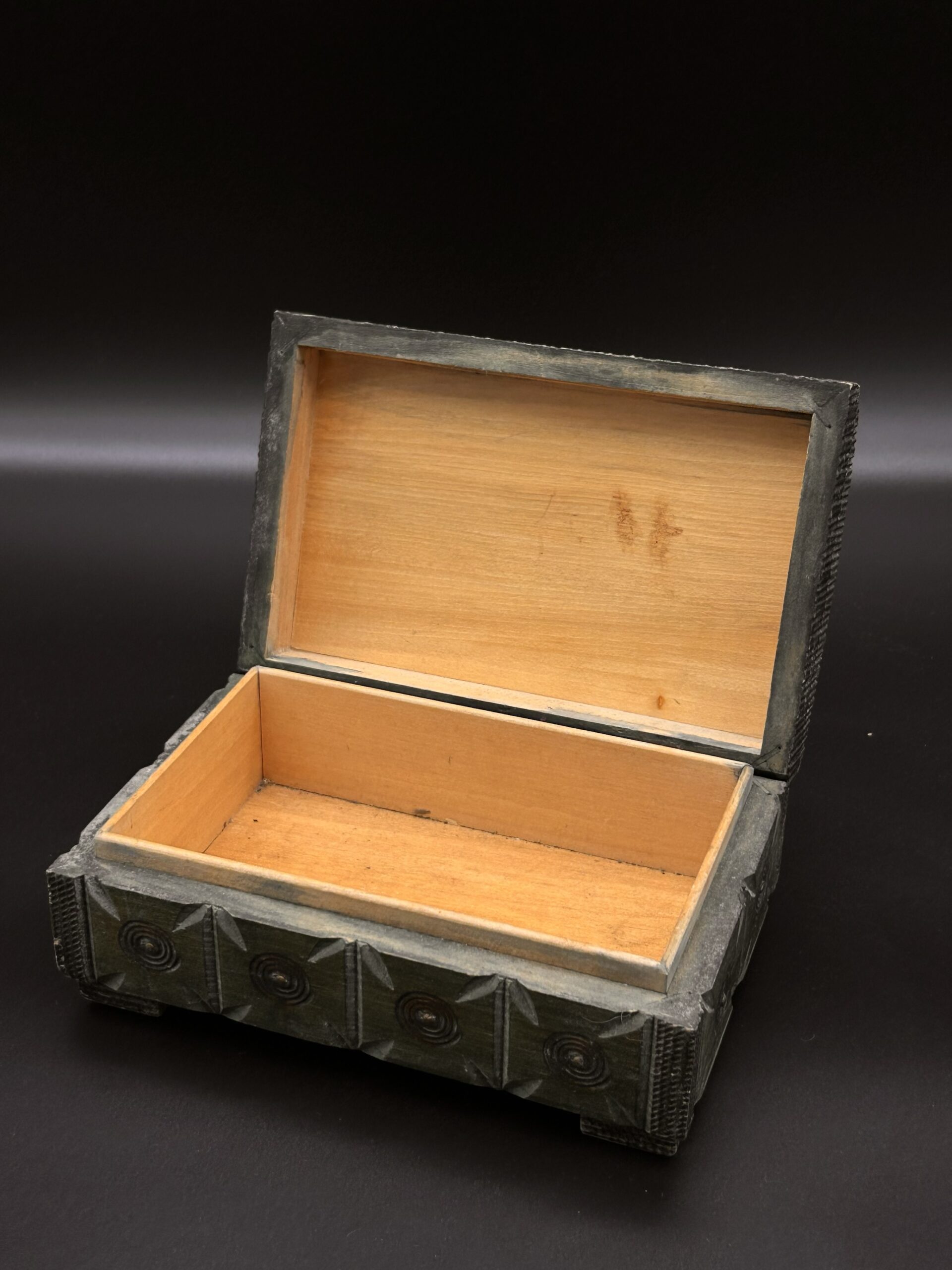 Ozdobna szkatułka z drewna o prostokątnym kształcie, pokryta geometrycznym wzorem z tłoczeniami i zdobieniami. Idealna do przechowywania biżuterii, drobiazgów lub jako unikatowy element dekoracyjny.