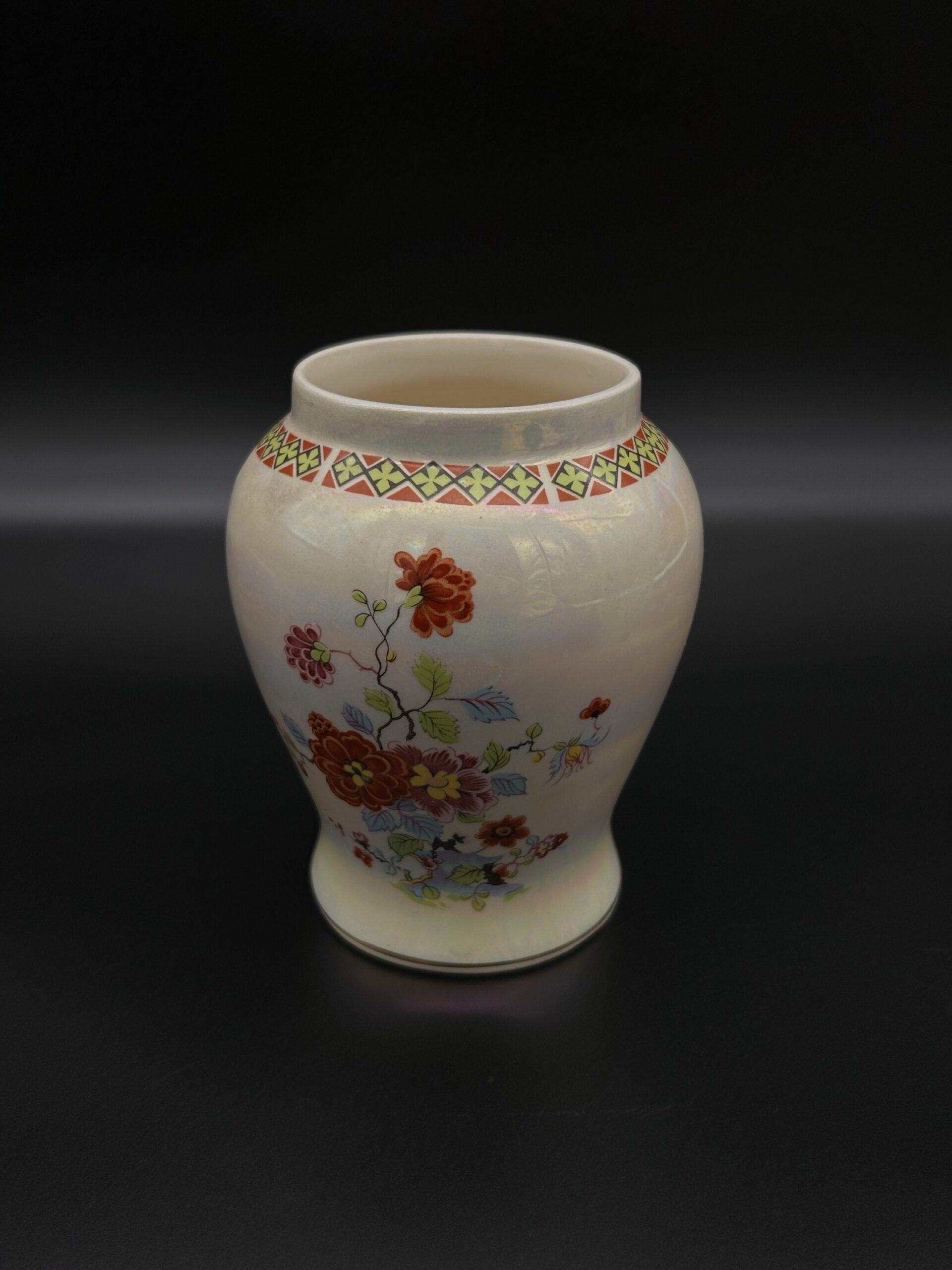 Wazon z połyskiem perłowym i barwnym motywem kwiatowym.