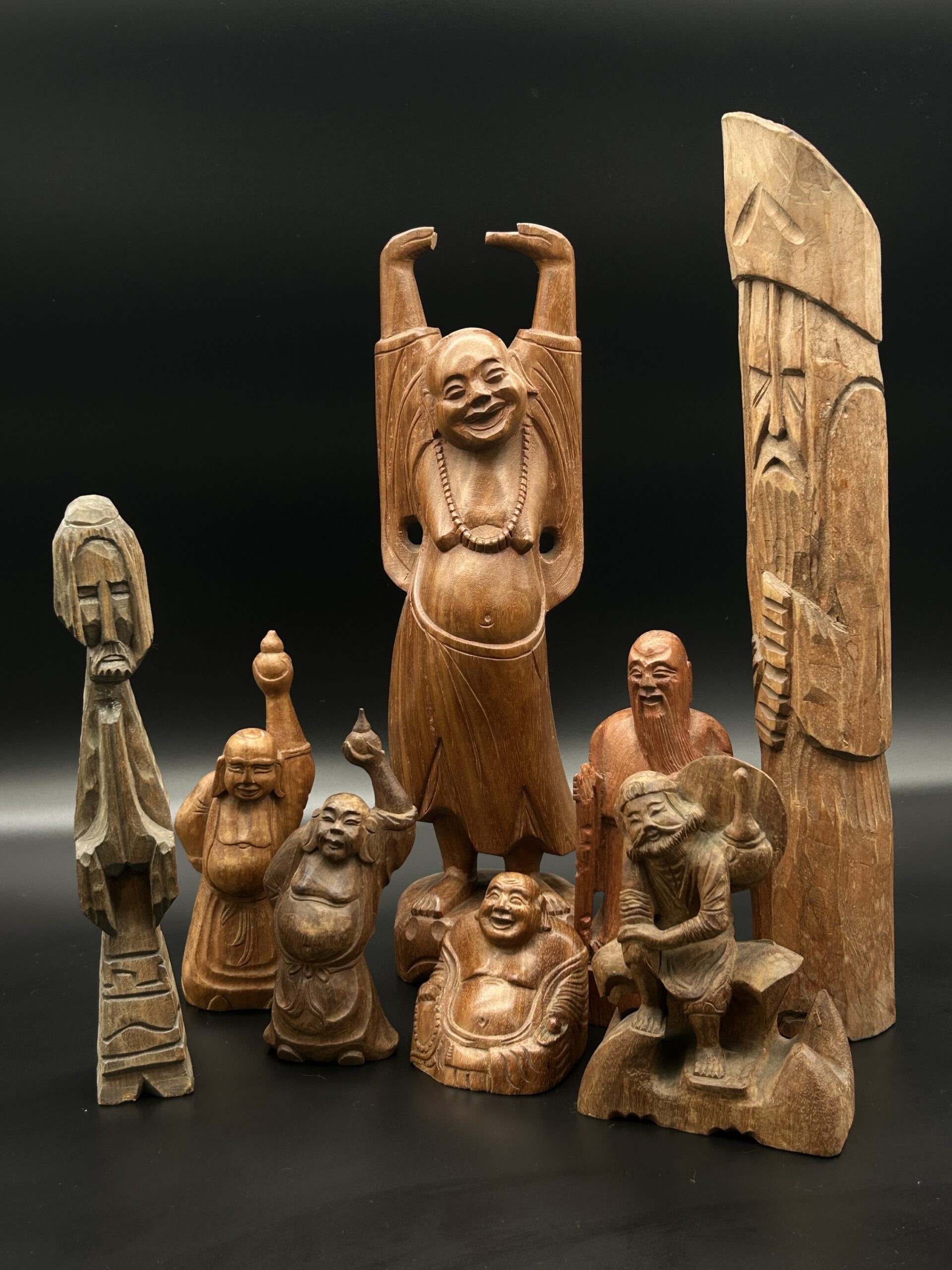 Orientalny zestaw siedmiu figurek Buddy i mędrców wykonanych ręcznie z drewna.